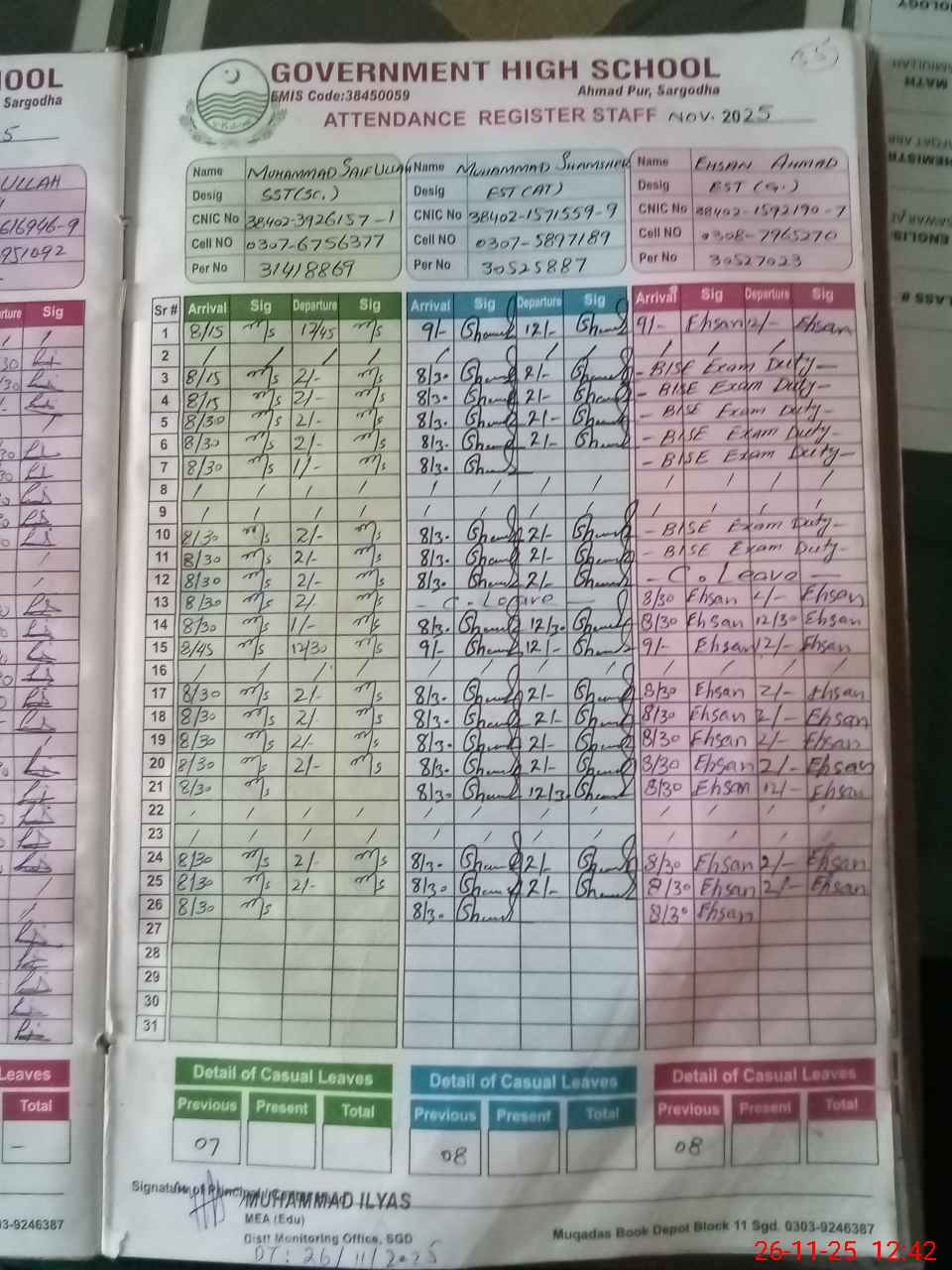 | CNIC | Full Name | Designation | R/C | Absence during last cal. month |