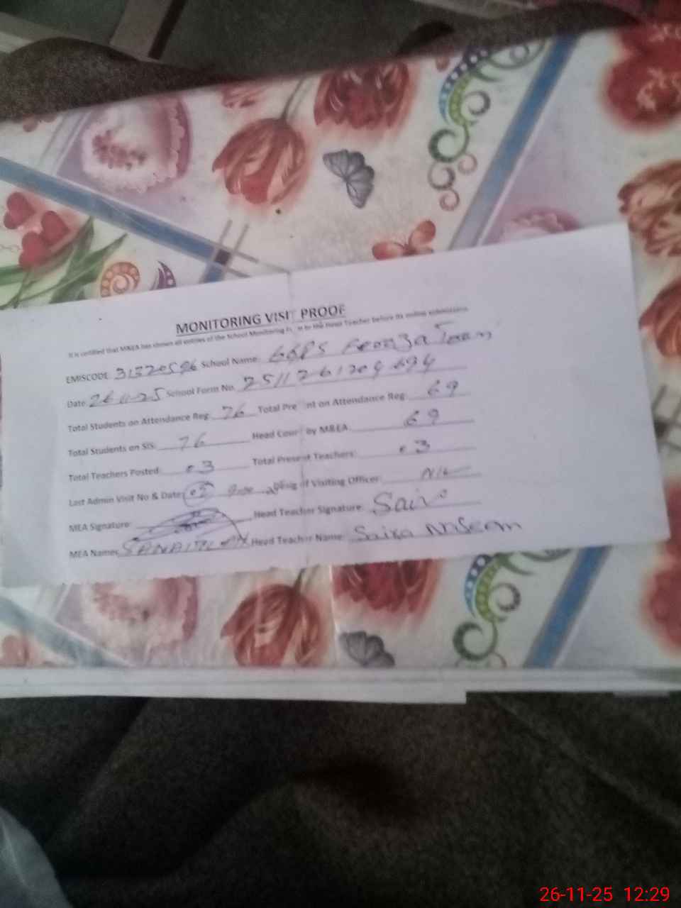 | Attendance Register | Head Teacher | MEA with School | Visit Proof |
