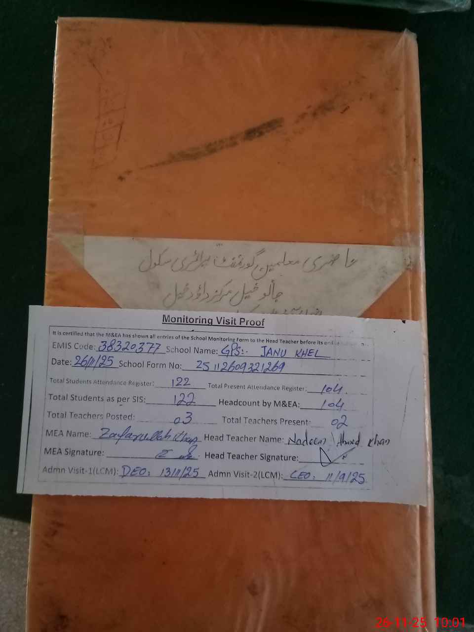 | Attendance Register | Head Teacher | MEA with School | Visit Proof |