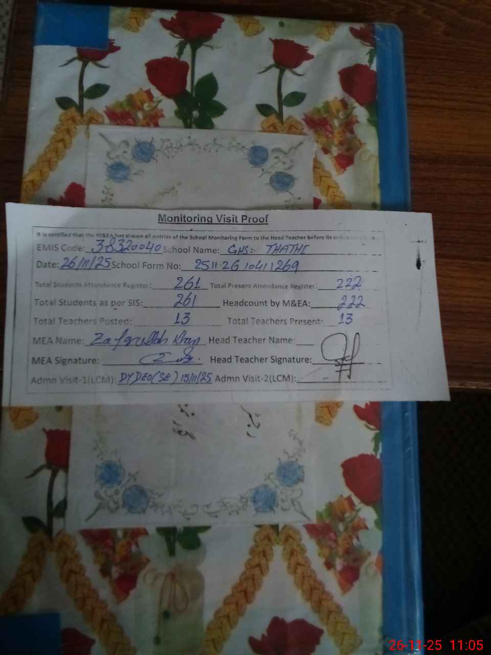 | Attendance Register | Head Teacher | MEA with School | Visit Proof |
