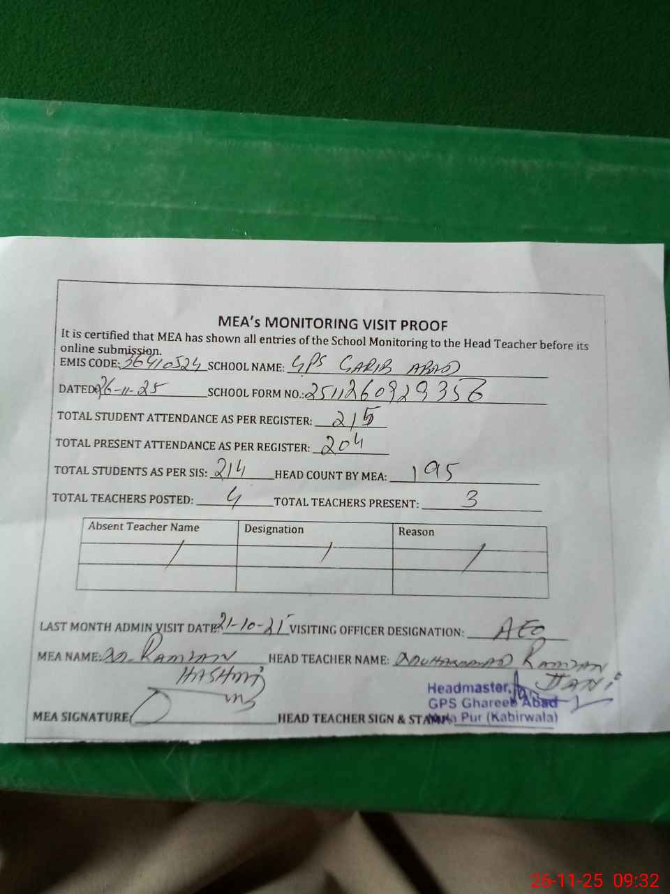 | EMIS Code: 36410524 | Name of School: GPS GHARIB ABAD MULA PUR KABIRWALA | |||