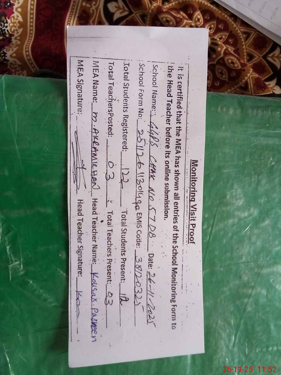 | Attendance Register | Head Teacher | MEA with School | Visit Proof |