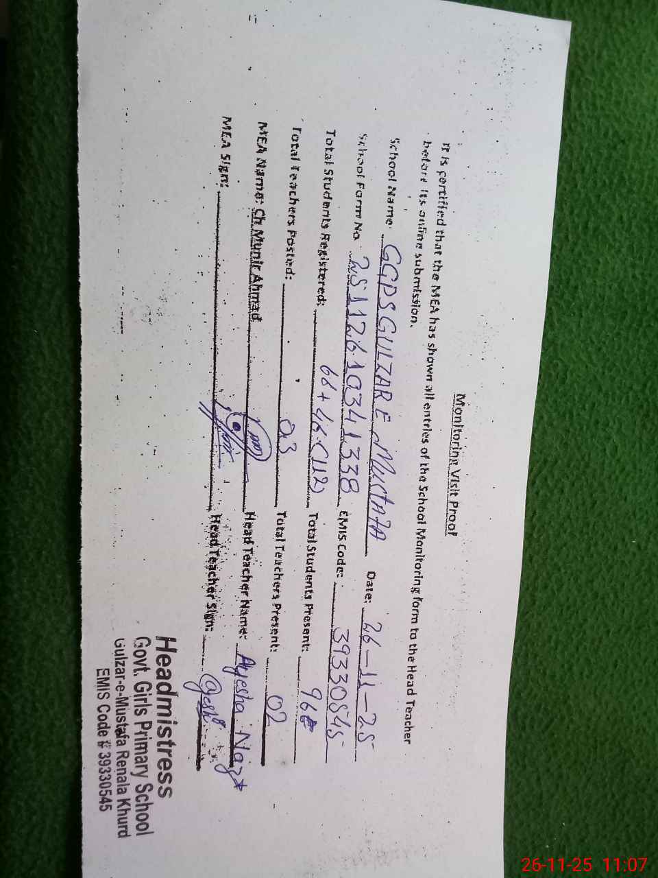 | EMIS Code: 39330545 | Name of School: GGPS GULZAR E MUSTAFA | |||