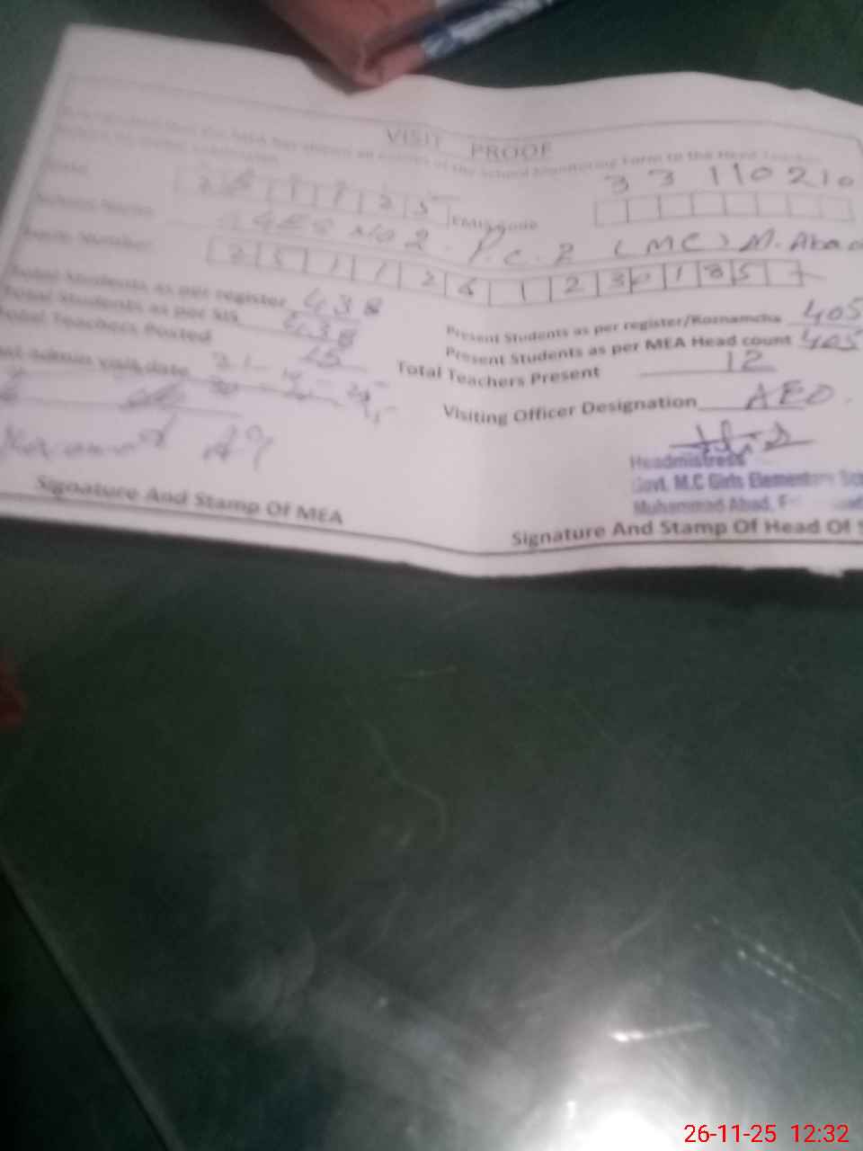 | Attendance Register | Head Teacher | MEA with School | Visit Proof |