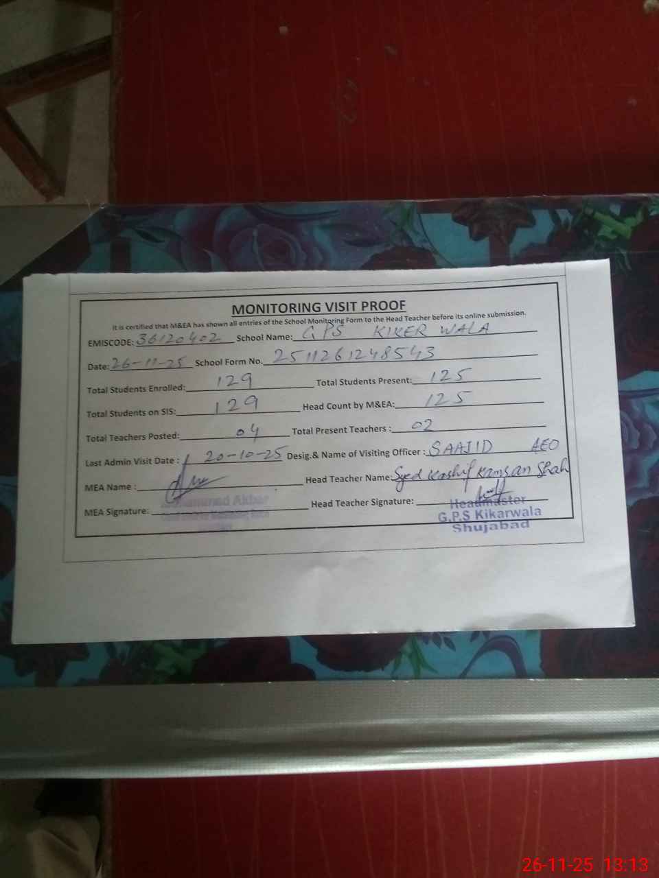 | EMIS Code: 36120402 | Name of School: GPS KIKAR WALA SHUJABAD | |||