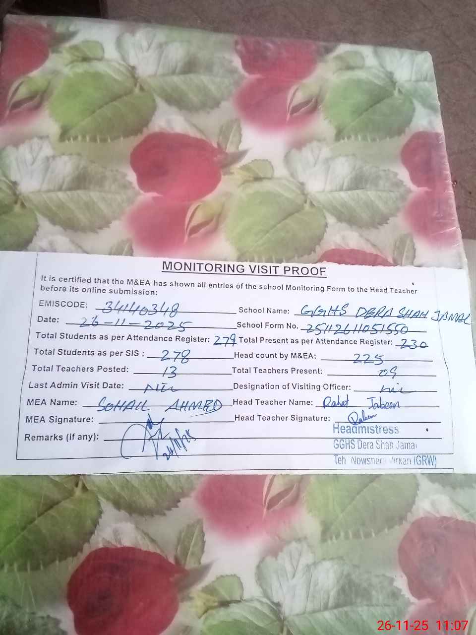 | Attendance Register | Head Teacher | MEA with School | Visit Proof |