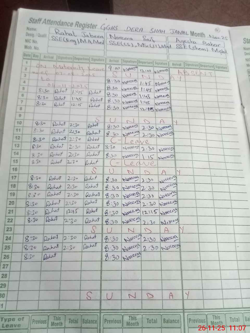 | 34**** | Ay**** Ba**** | ESE Science | Contract | 0 | 0 | 0 | 0 | 0 | 0 | 0 | 0 | 0 | Absent (Un-Authorized) |