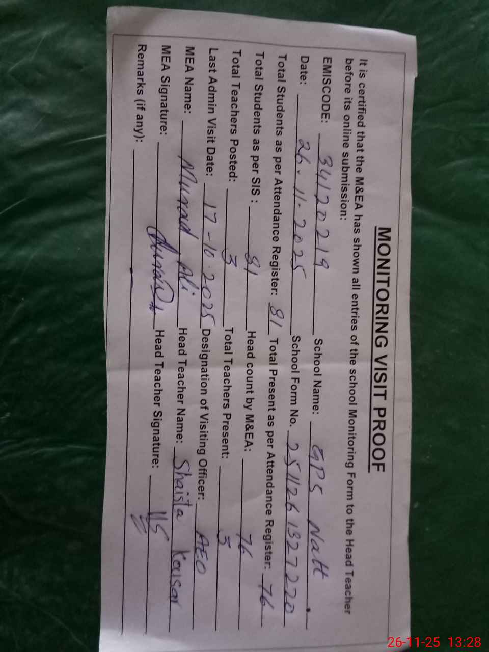 | Attendance Register | Head Teacher | MEA with School | Visit Proof |