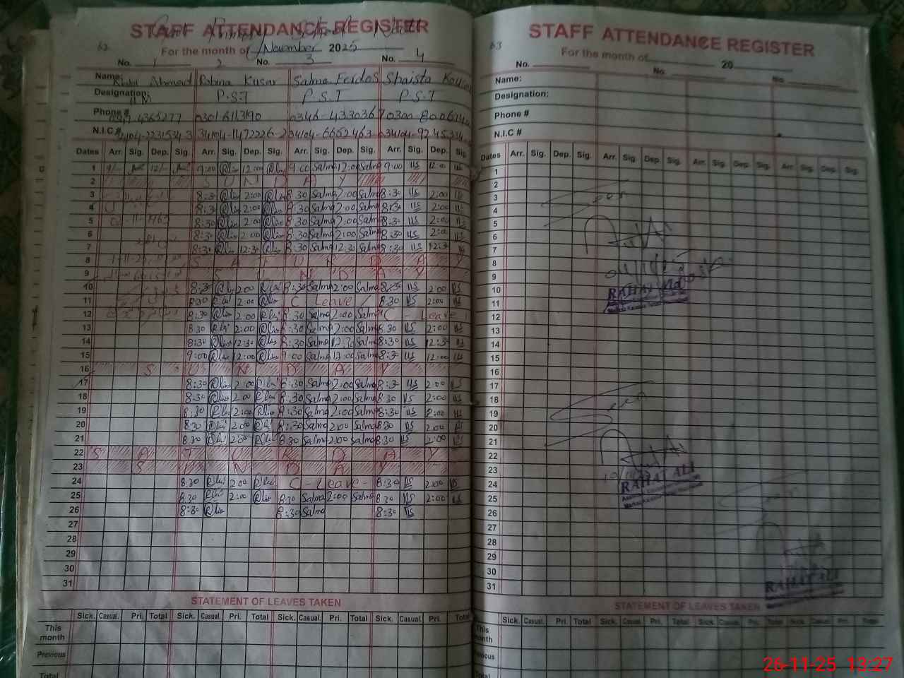 | CNIC | Full Name | Designation | R/C | Absence During Last Calender Month |