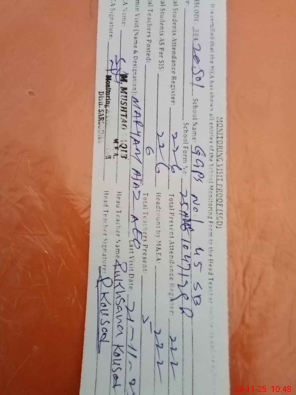 | Attendance Register | Head Teacher | MEA with School | Visit Proof |