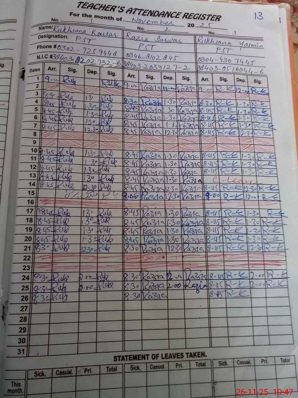 | CNIC | Full Name | Designation | R/C | Absence During Last Calender Month |