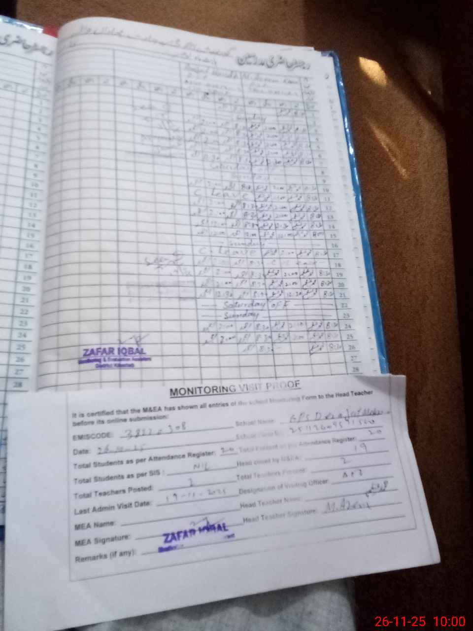 | Remarks (Use Separate Page if Required): Last visit AEO 19 November 2025 no data on sis available with teacher Total on register 20 | |||||