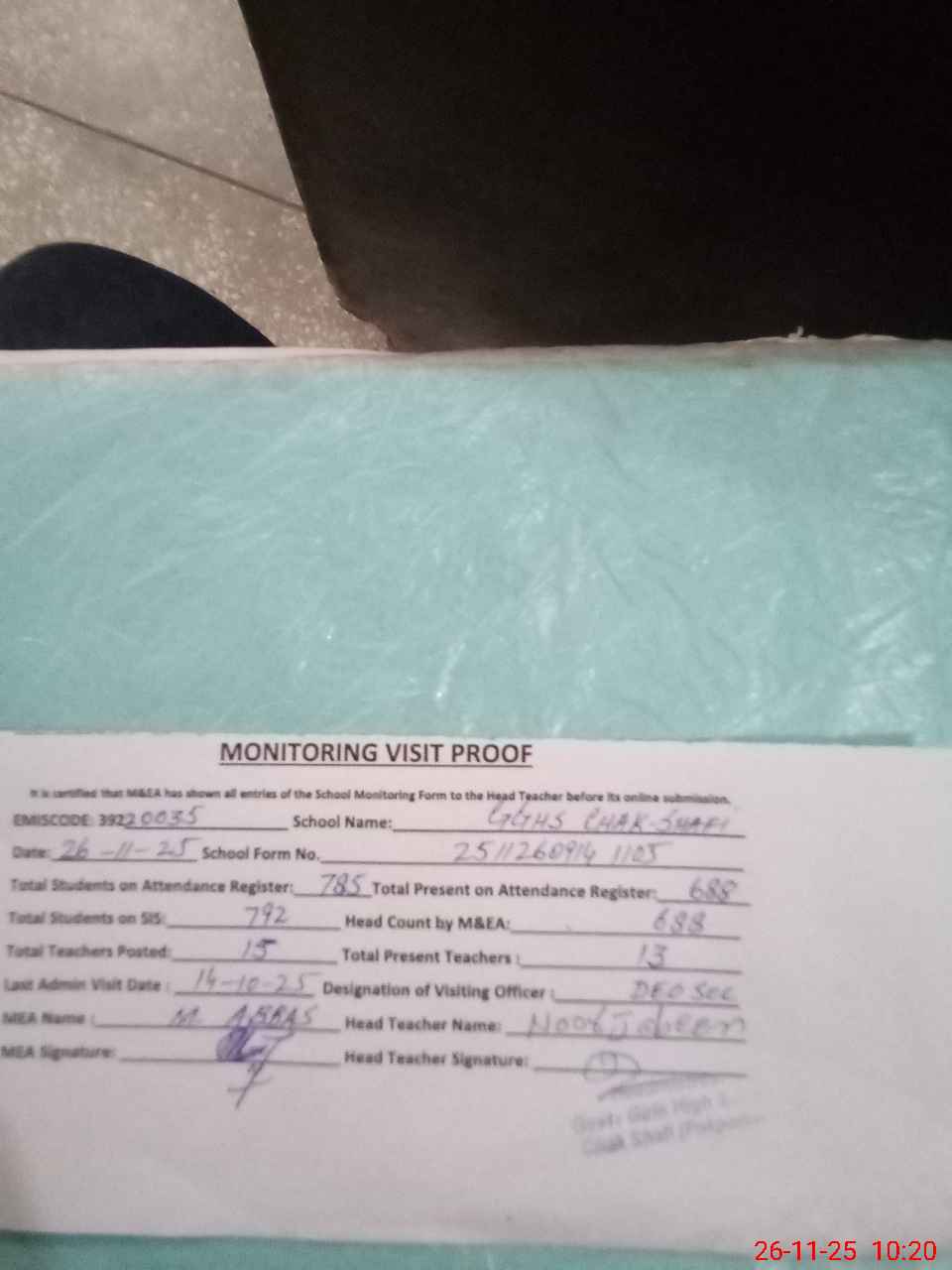 | Attendance Register | Head Teacher | MEA with School | Visit Proof |