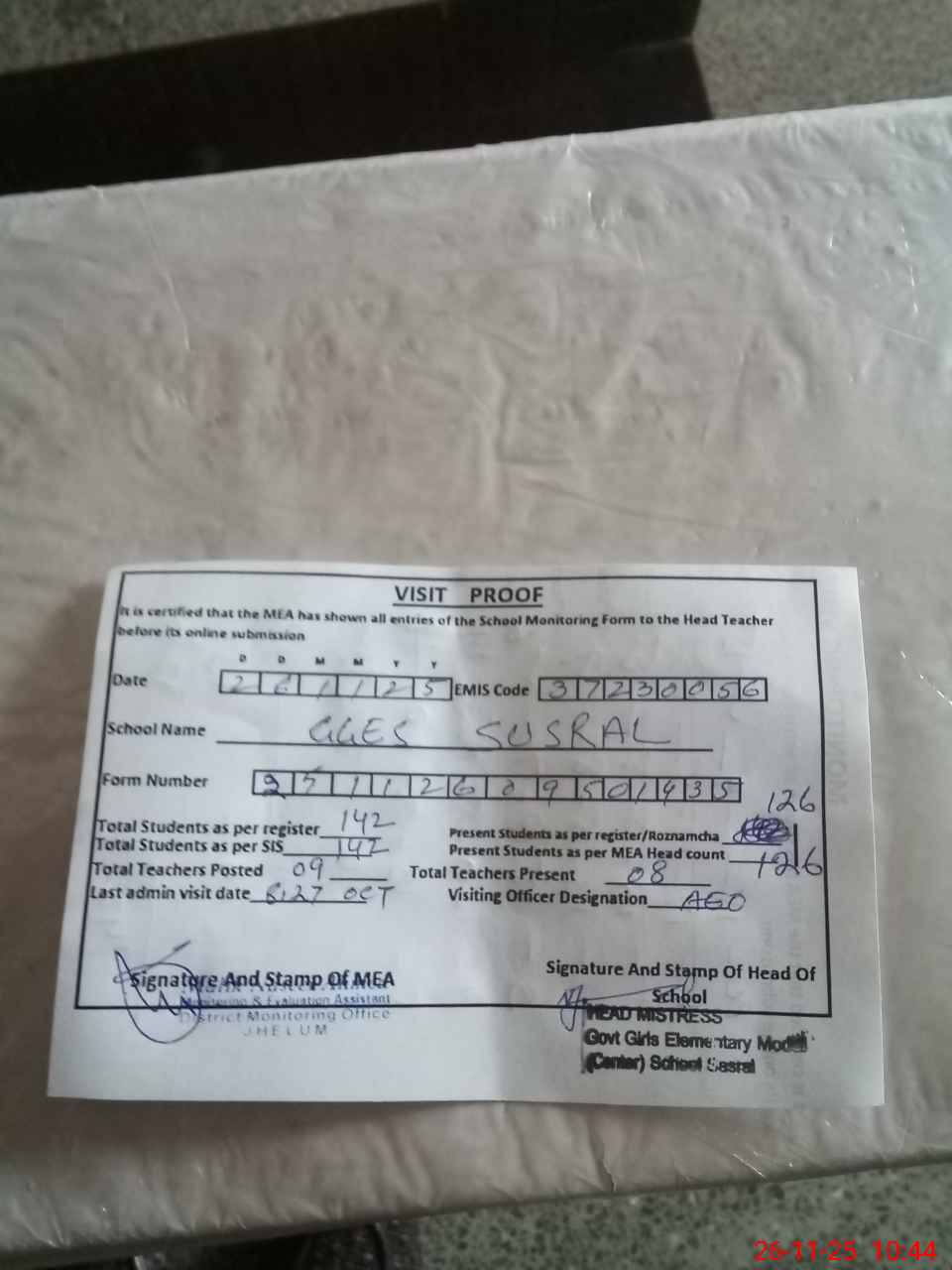 | Attendance Register | Head Teacher | MEA with School | Visit Proof |