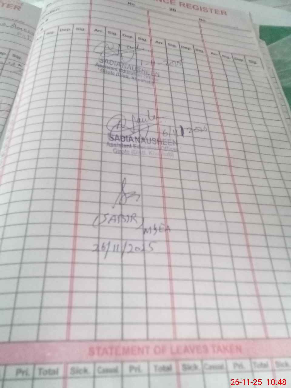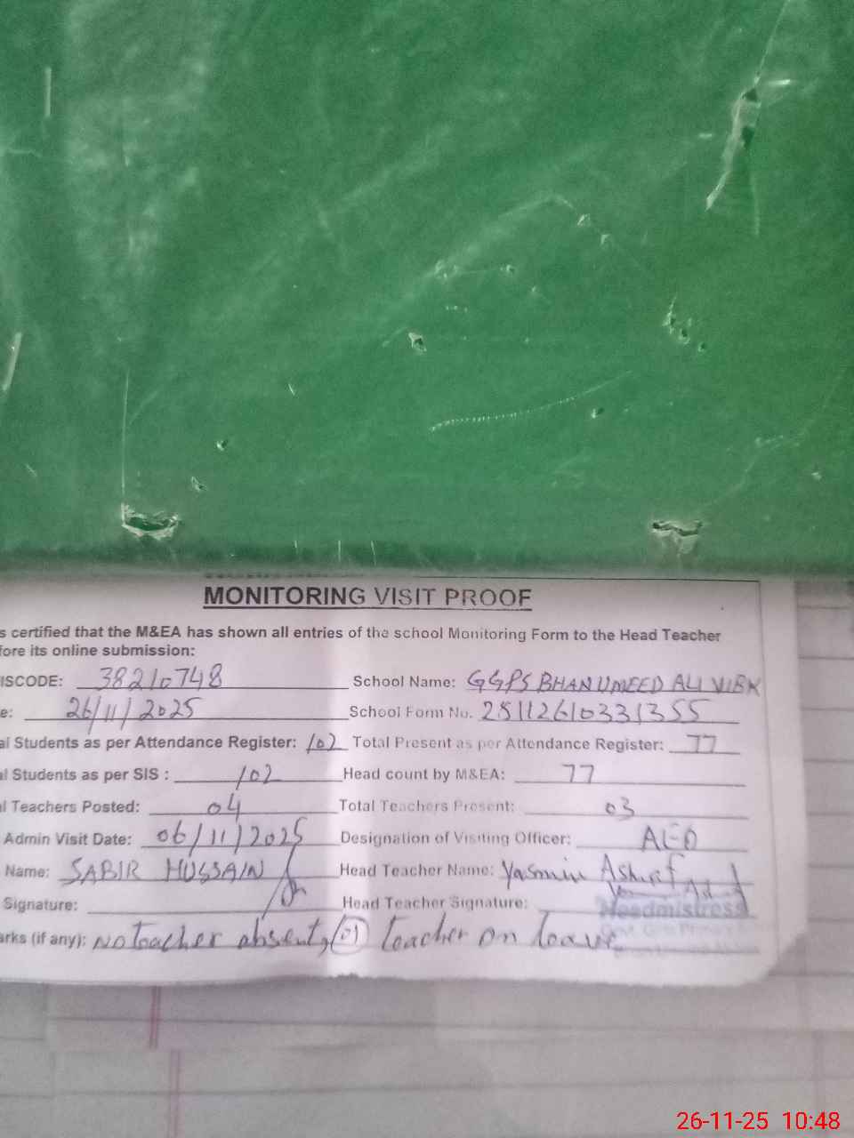 | Remarks (Use Separate Page if Required): no teacher absent total students 102 present students 77 last admin visit by AEO on 06 Nov 2025 | |||||