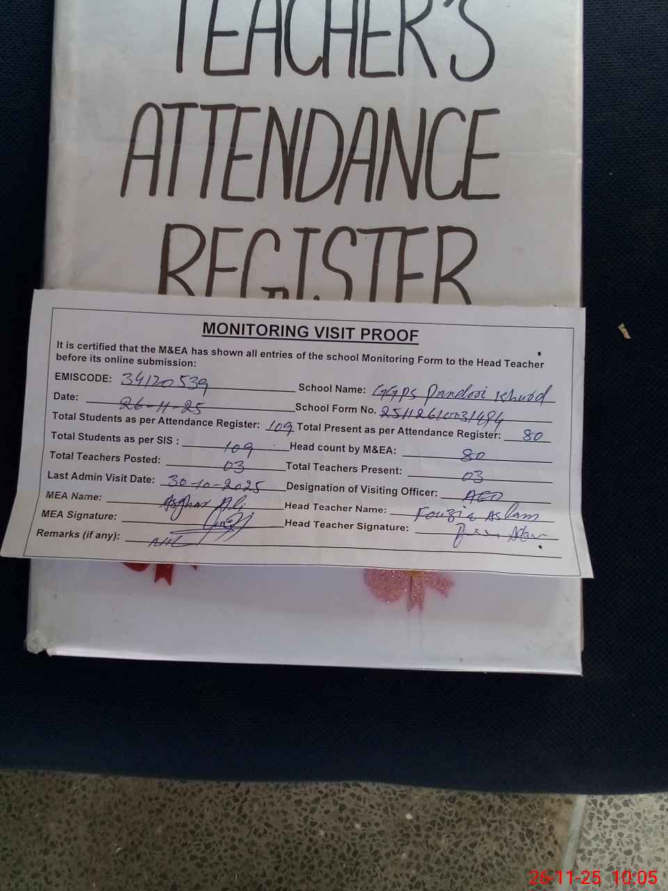 | Attendance Register | Head Teacher | MEA with School | Visit Proof |