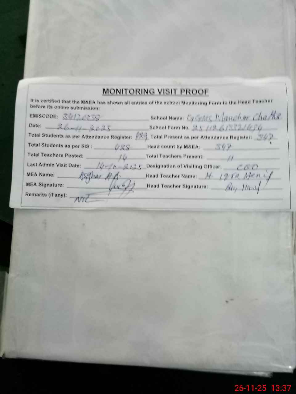 | Attendance Register | Head Teacher | MEA with School | Visit Proof |