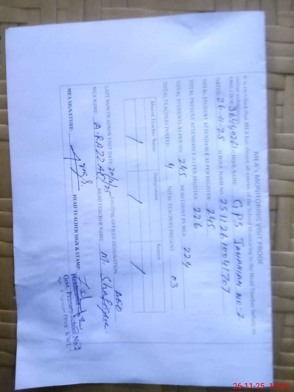| Attendance Register | Head Teacher | MEA with School | Visit Proof |