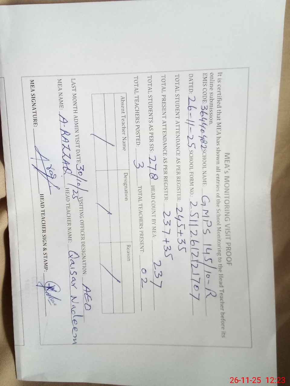 | Attendance Register | Head Teacher | MEA with School | Visit Proof |
