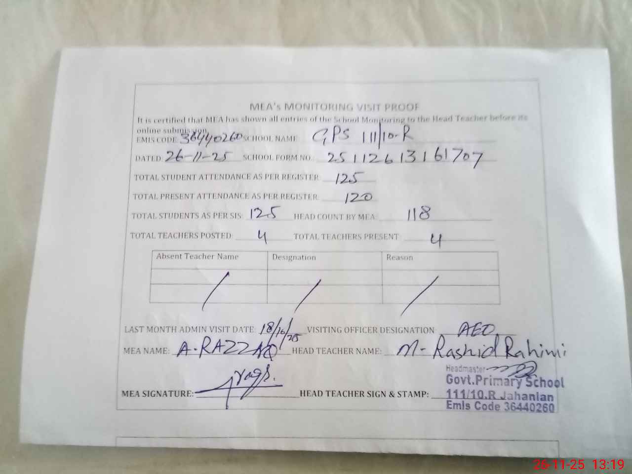 | Attendance Register | Head Teacher | MEA with School | Visit Proof |