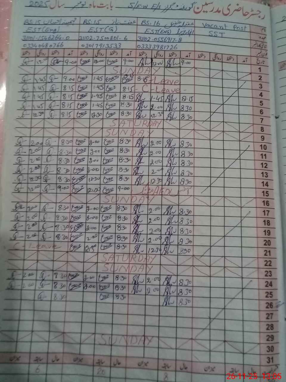 | CNIC | Full Name | Designation | R/C | Absence During Last Calender Month |