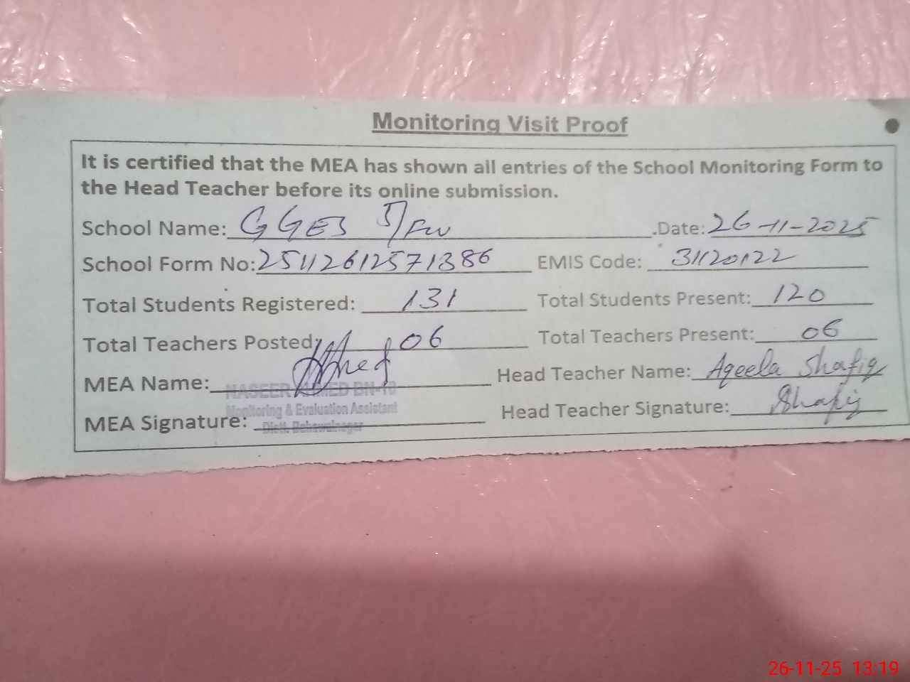 | Attendance Register | Head Teacher | MEA with School | Visit Proof |