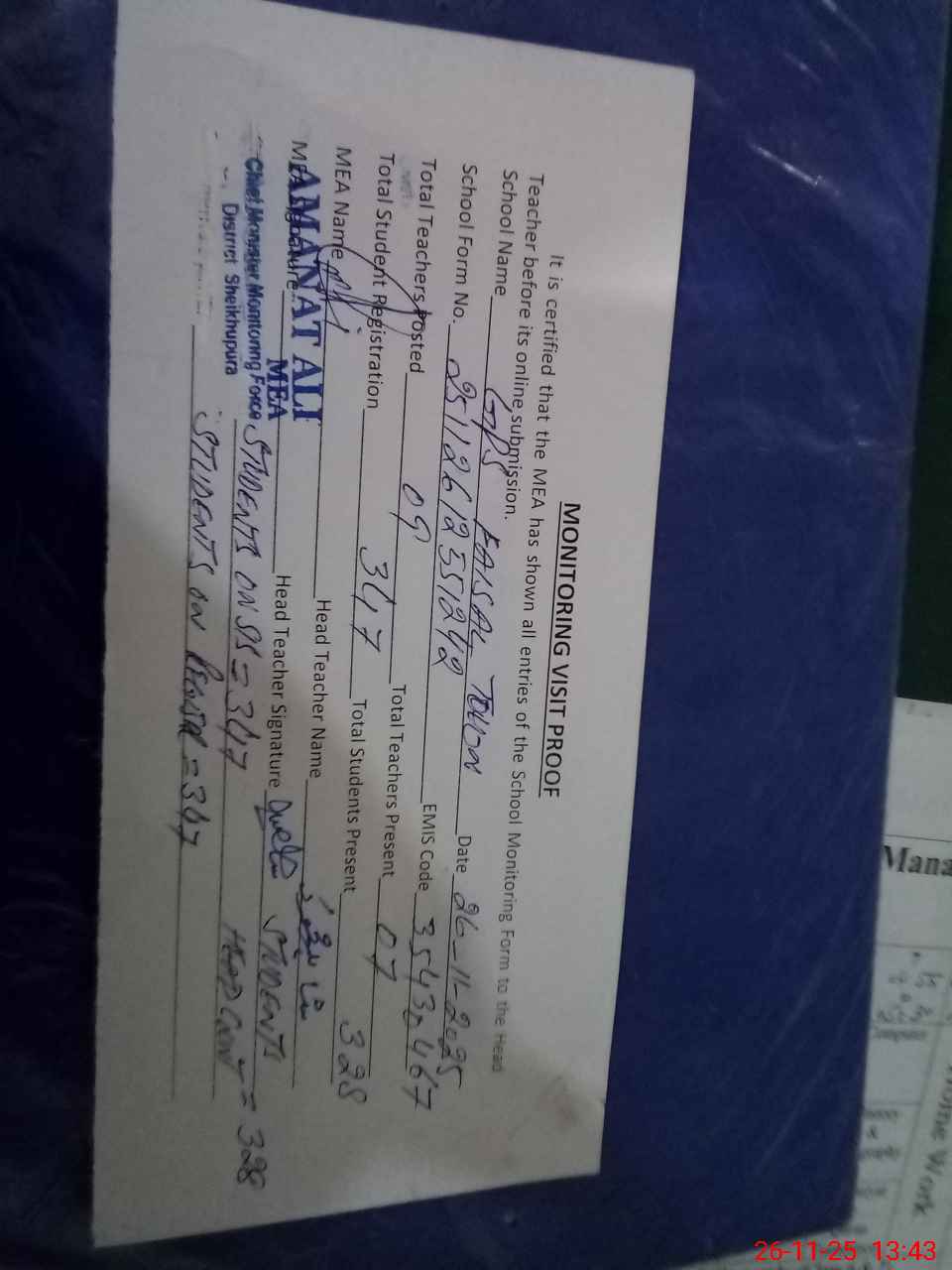 | Attendance Register | Head Teacher | MEA with School | Visit Proof |