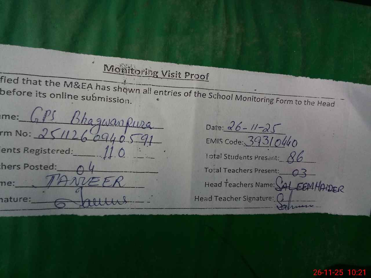 | Attendance Register | Head Teacher | MEA with School | Visit Proof |