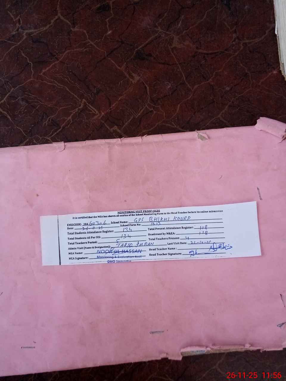 | Attendance Register | Head Teacher | MEA with School | Visit Proof |