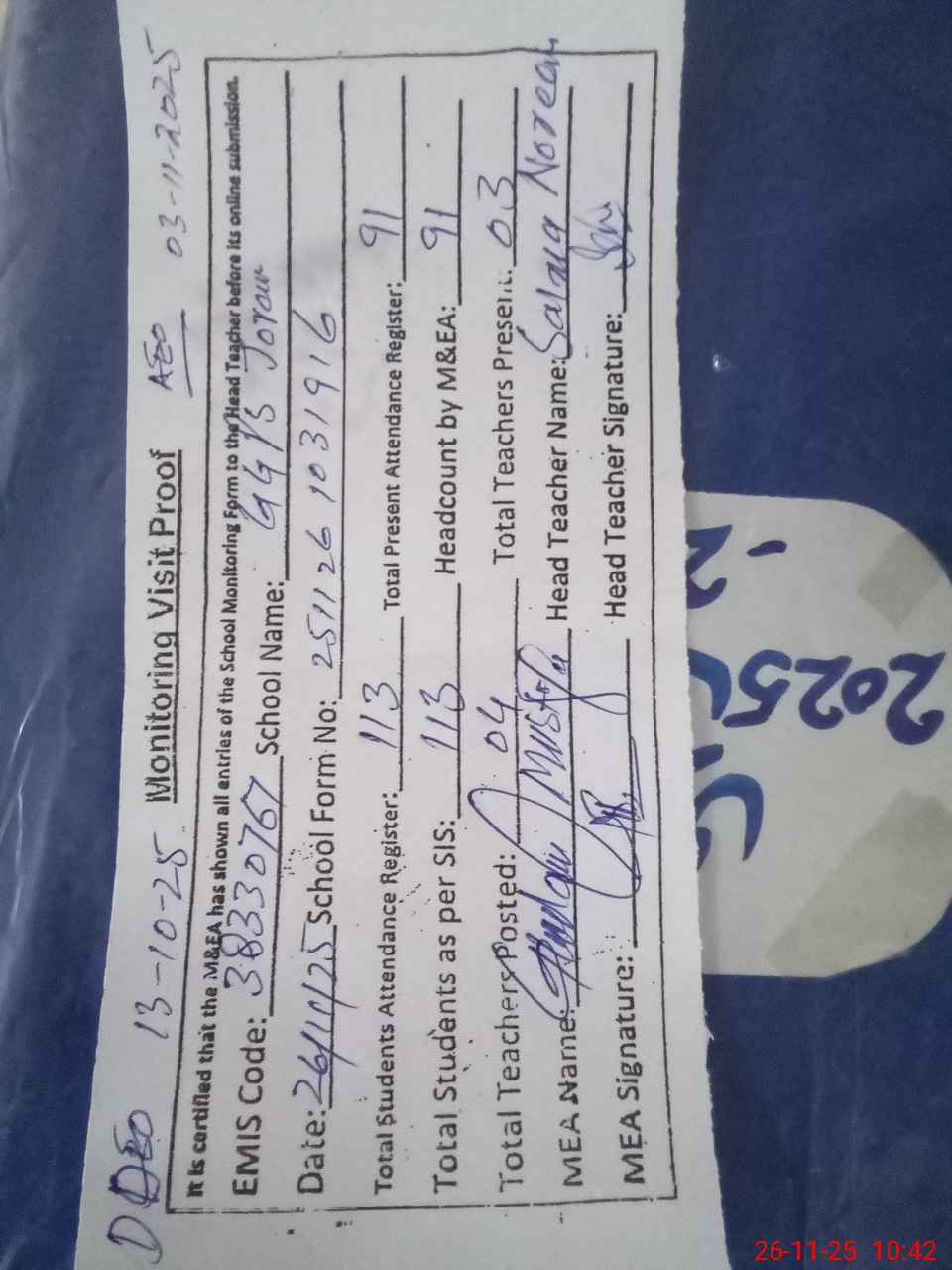 | Attendance Register | Head Teacher | MEA with School | Visit Proof |