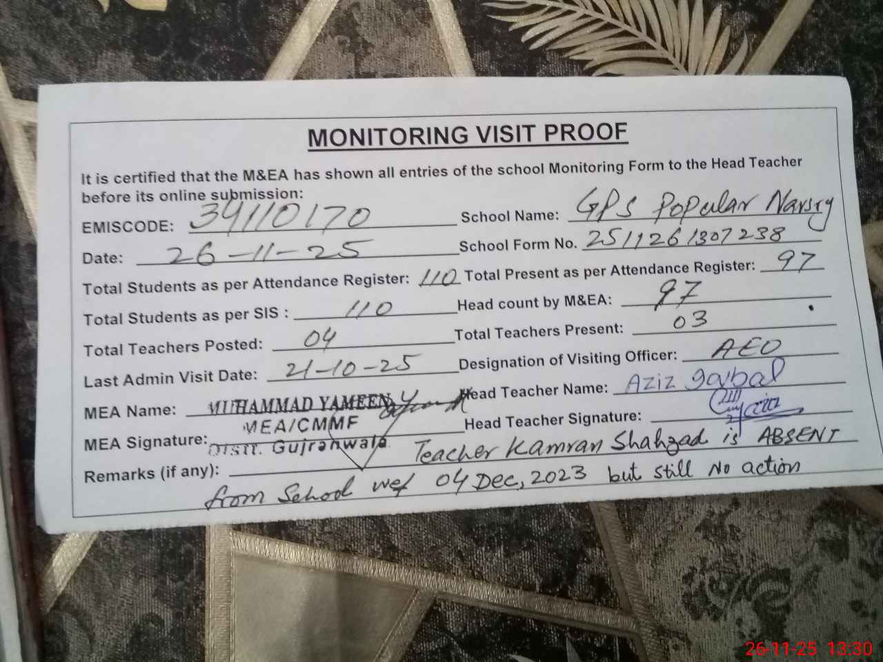 | Remarks (Use Separate Page if Required): Teacher KAMRAN SHAHZAD is ABSENT from duty wef 04 December 2023 but still no against him | |||||
