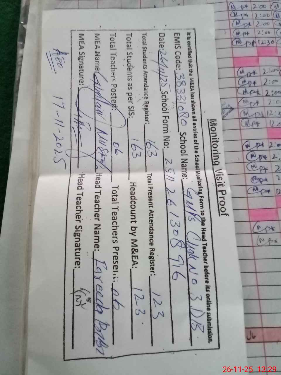 | Attendance Register | Head Teacher | MEA with School | Visit Proof |