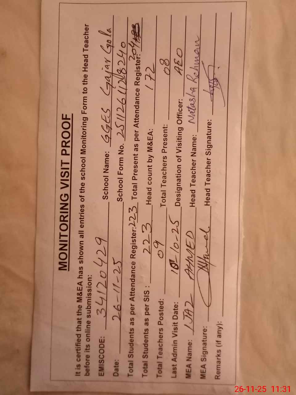 | Attendance Register | Head Teacher | MEA with School | Visit Proof |