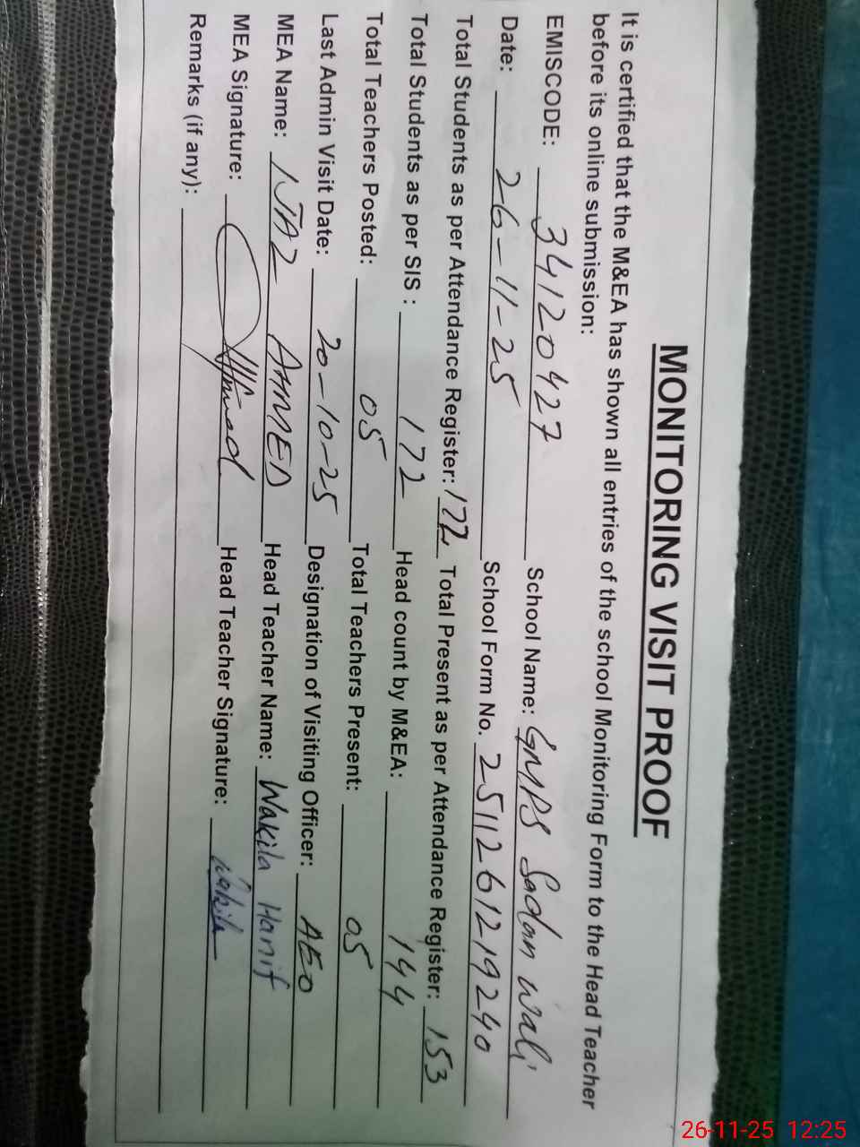 | Attendance Register | Head Teacher | MEA with School | Visit Proof |