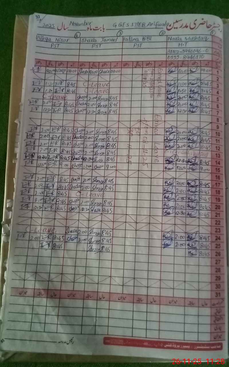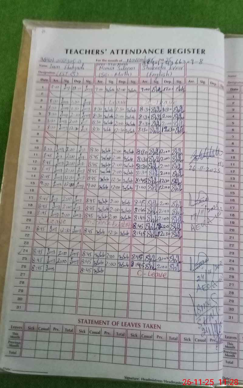 | Remarks (Use Separate Page if Required): STI IRAM SHEHZADI STI NIMRA SALEEM PRESENT. STI SHAKEELA IQRAR CASUAL LEAVE | |||||