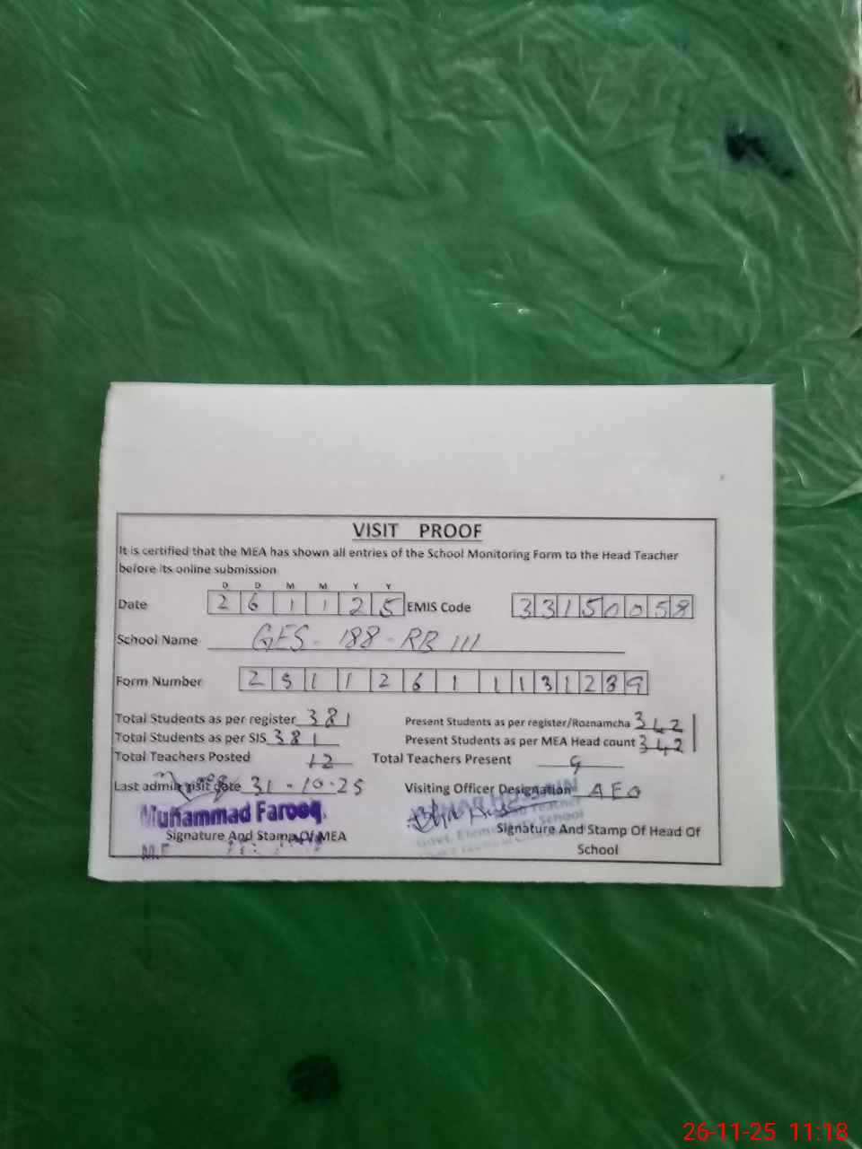 | Attendance Register | Head Teacher | MEA with School | Visit Proof |