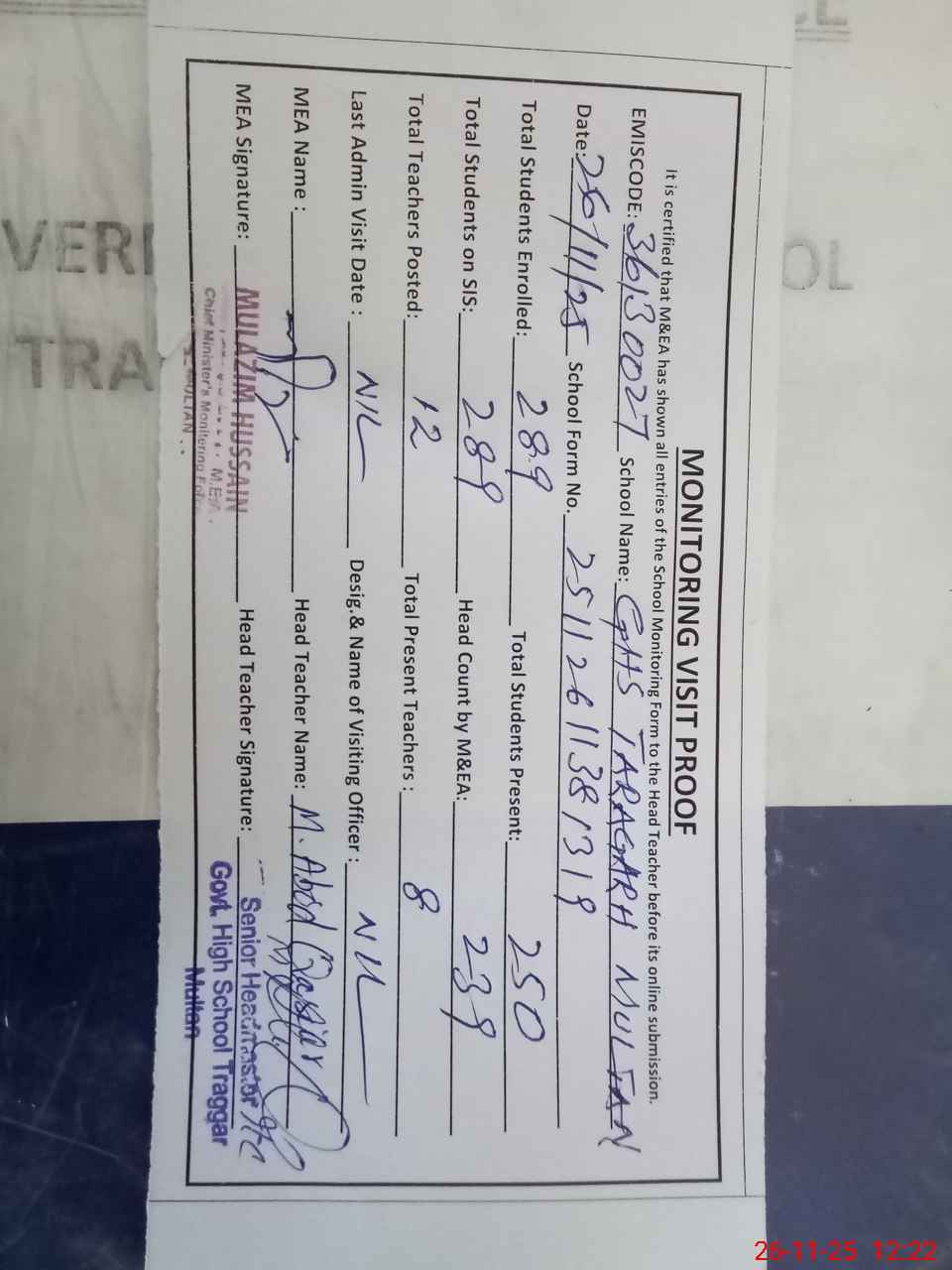 | Attendance Register | Head Teacher | MEA with School | Visit Proof |