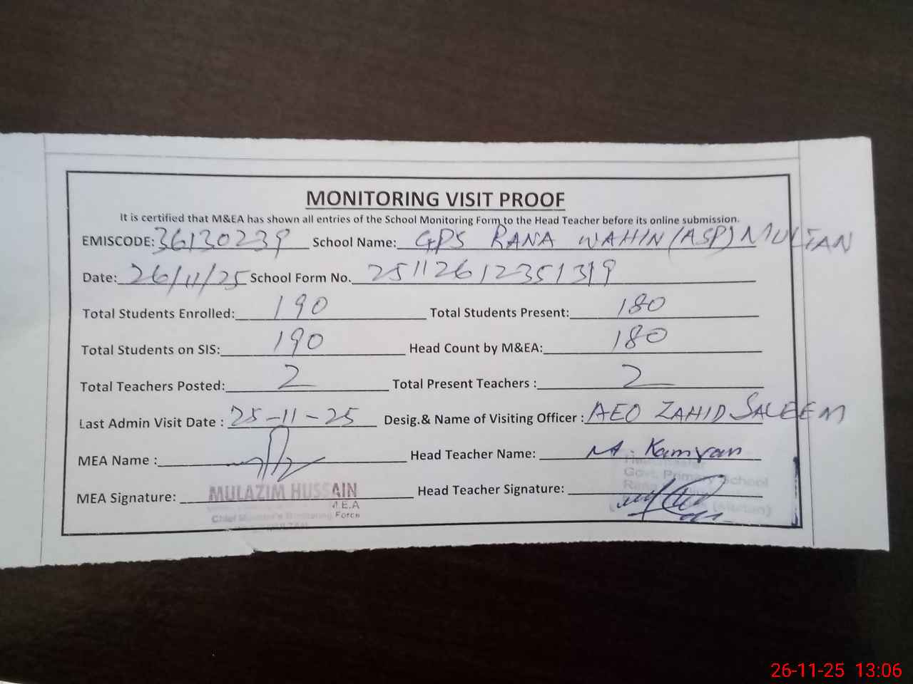 | Attendance Register | Head Teacher | MEA with School | Visit Proof |