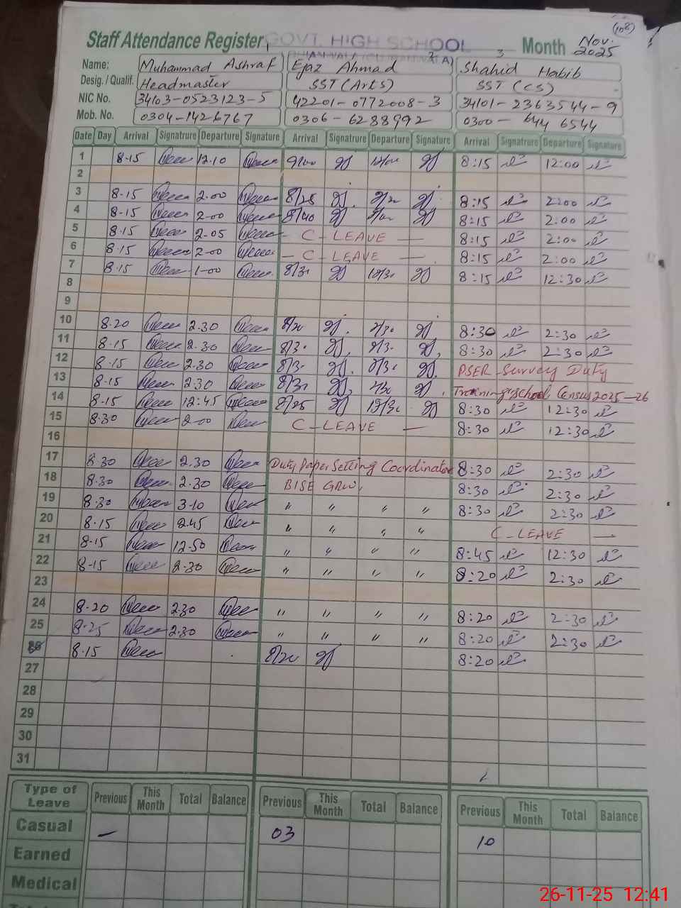 | CNIC | Full Name | Designation | R/C | Absence during last cal. month |