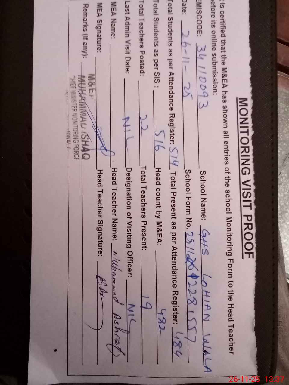| Attendance Register | Head Teacher | MEA with School | Visit Proof |