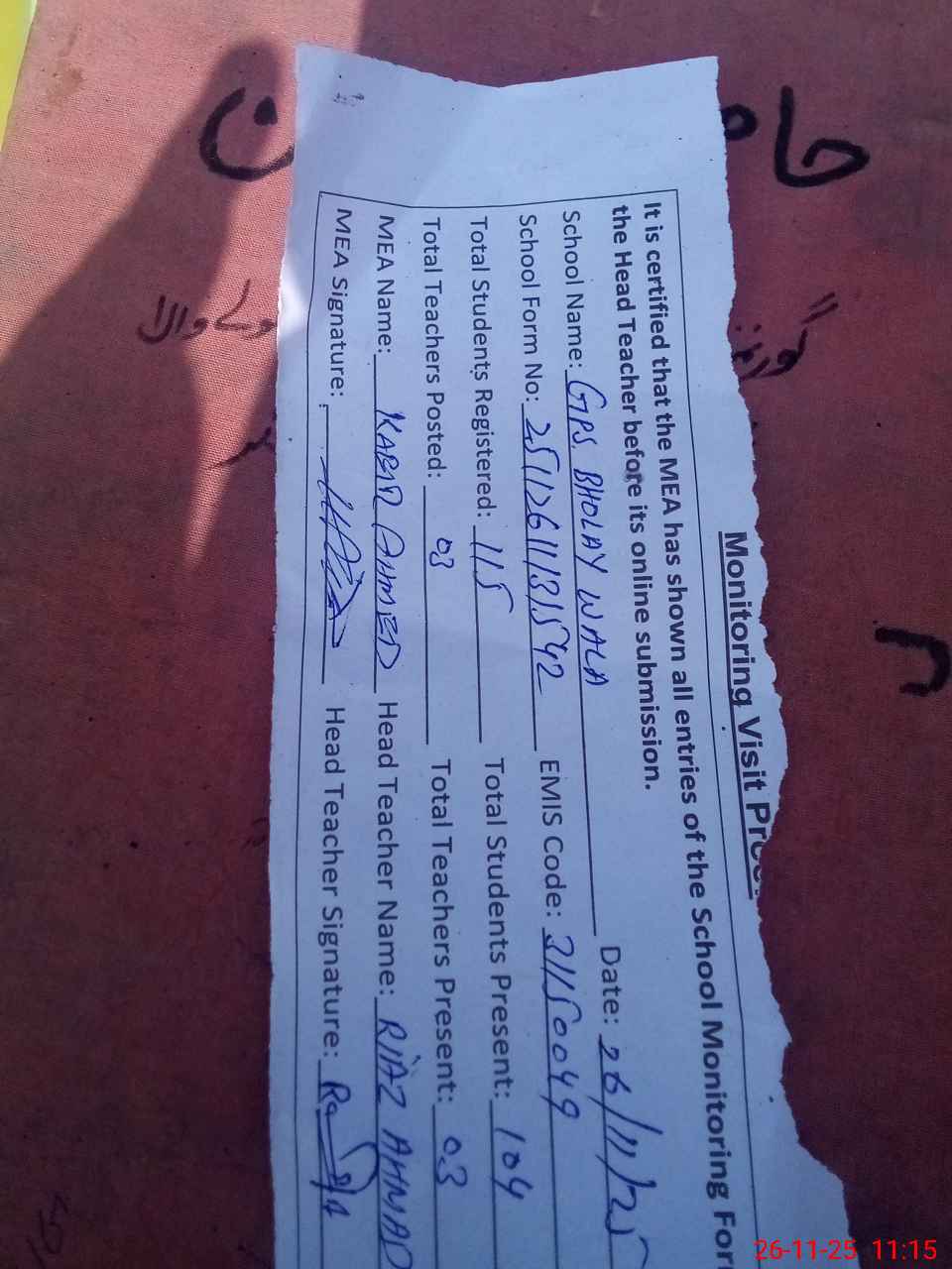 | EMIS Code: 31150049 | Name of School: GPS BHOLEY WALA | |||