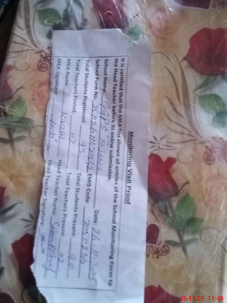 | Attendance Register | Head Teacher | MEA with School | Visit Proof |