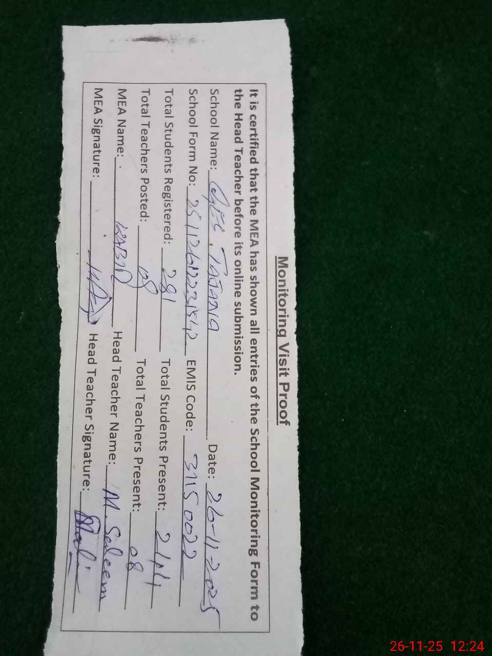 | Attendance Register | Head Teacher | MEA with School | Visit Proof |