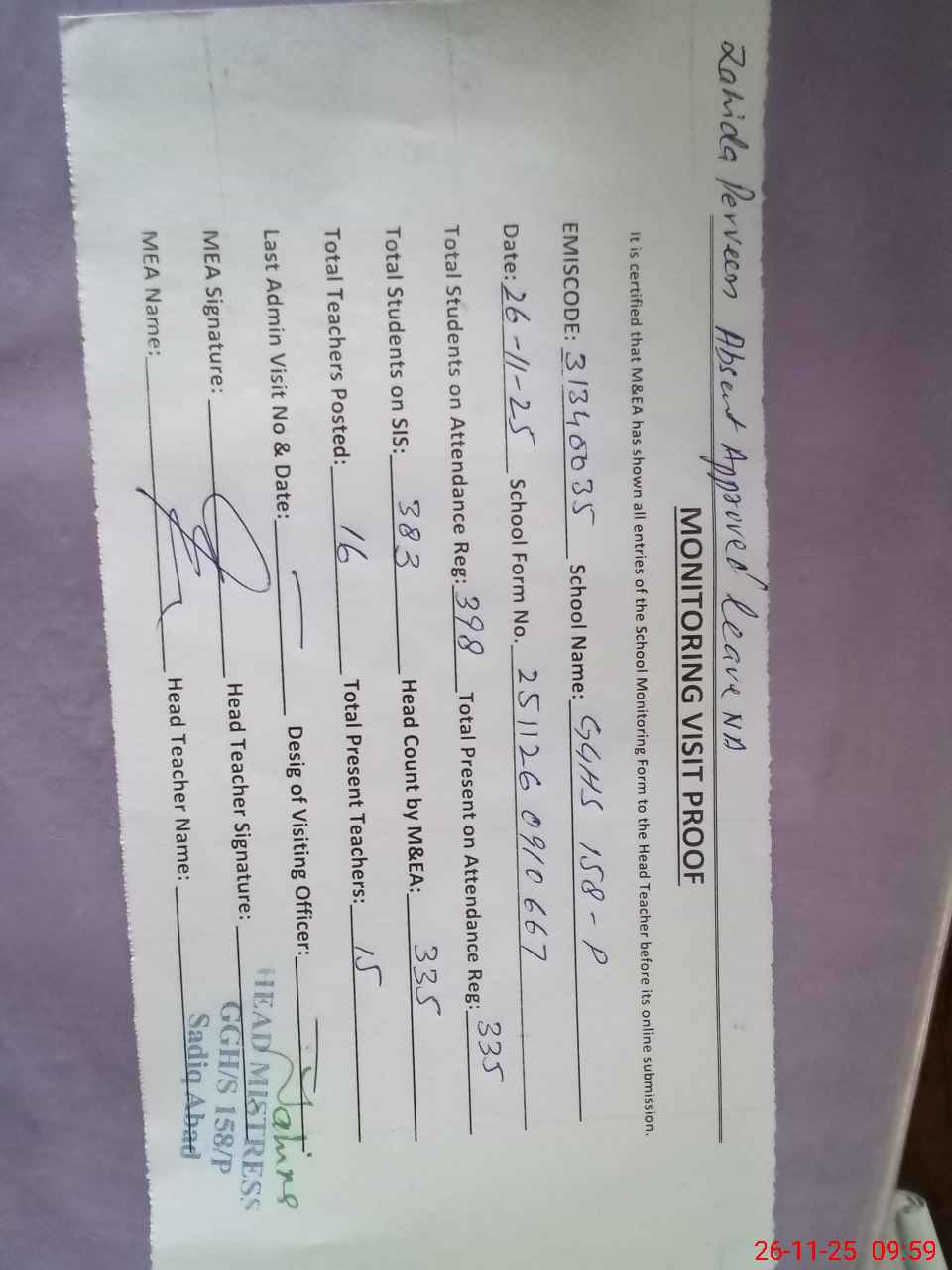 | Attendance Register | Head Teacher | MEA with School | Visit Proof |