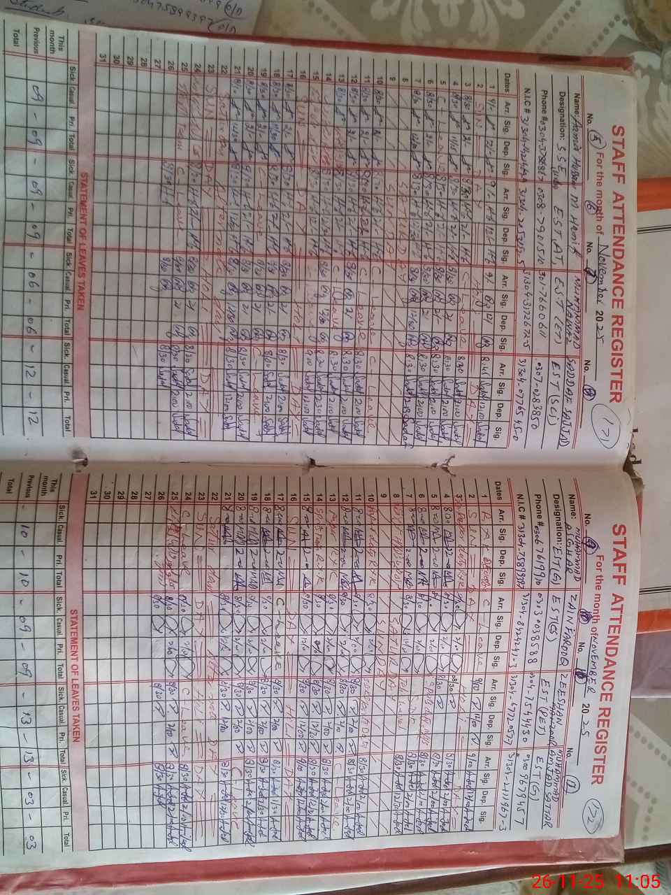 | CNIC | Full Name | Designation | R/C | Absence during last cal. month |