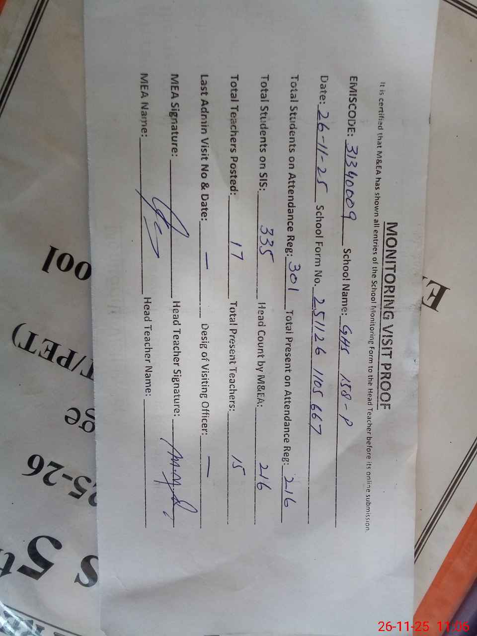 | Attendance Register | Head Teacher | MEA with School | Visit Proof |
