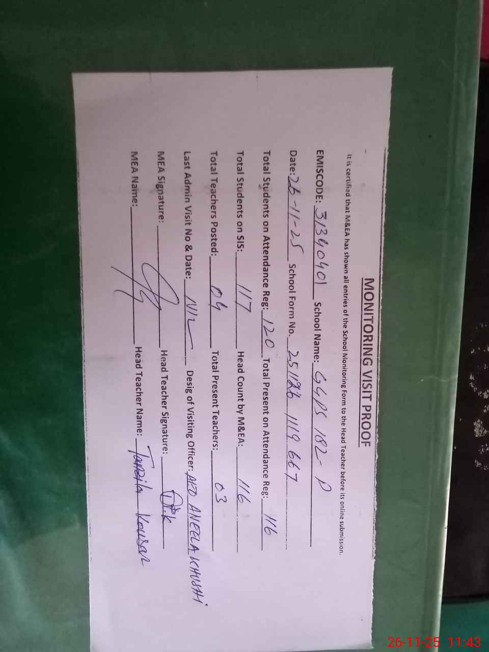 | Attendance Register | Head Teacher | MEA with School | Visit Proof |
