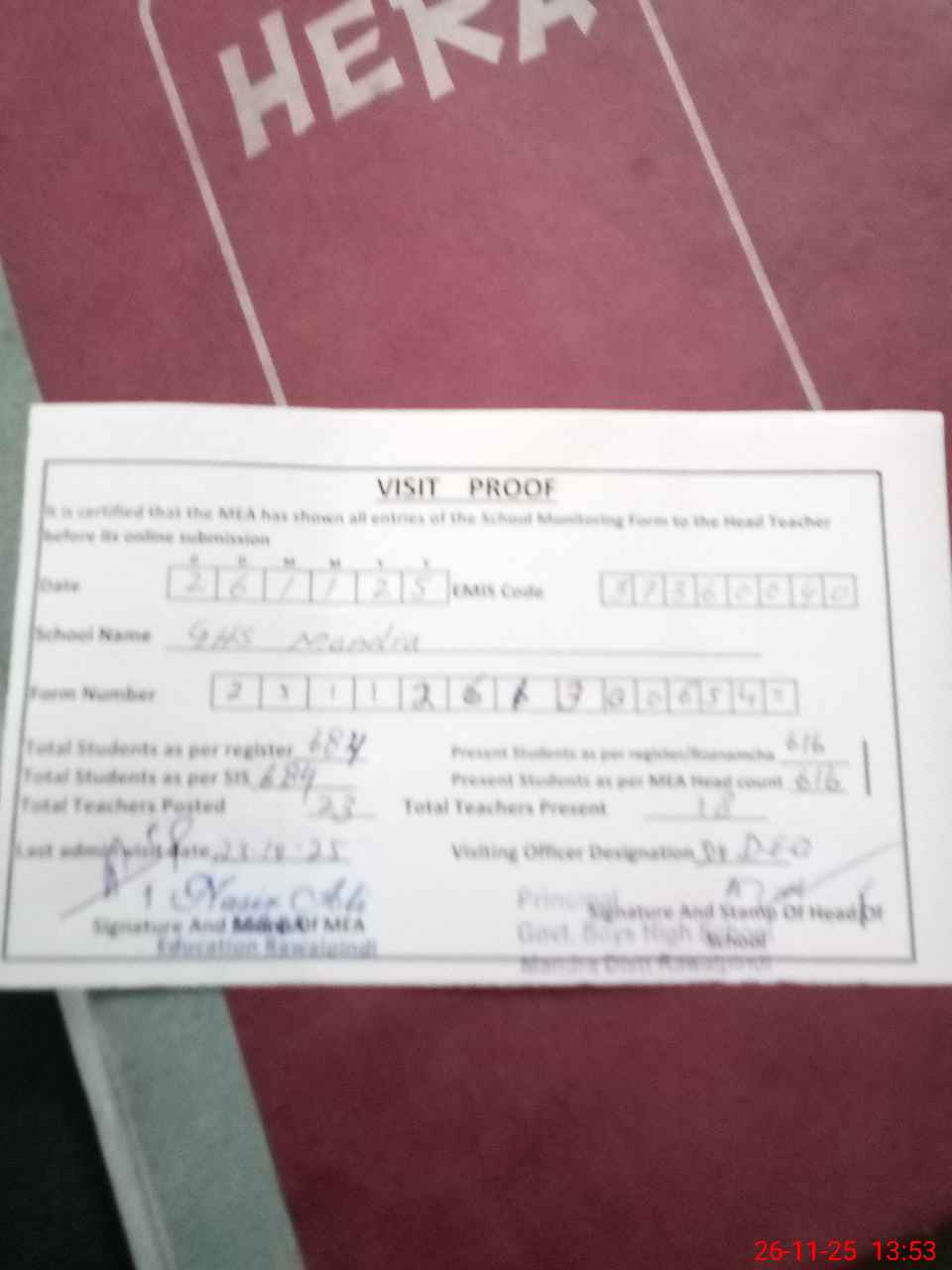| Certified that this School was Inspected by the Undersigned MEA/DMO Today and the Information Stated Above is as Per Record. | |||||