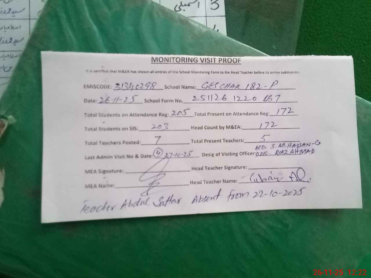 | Attendance Register | Head Teacher | MEA with School | Visit Proof |