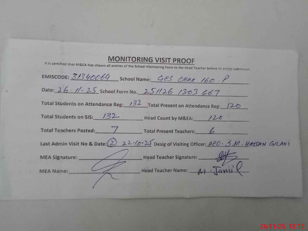 | Attendance Register | Head Teacher | MEA with School | Visit Proof |